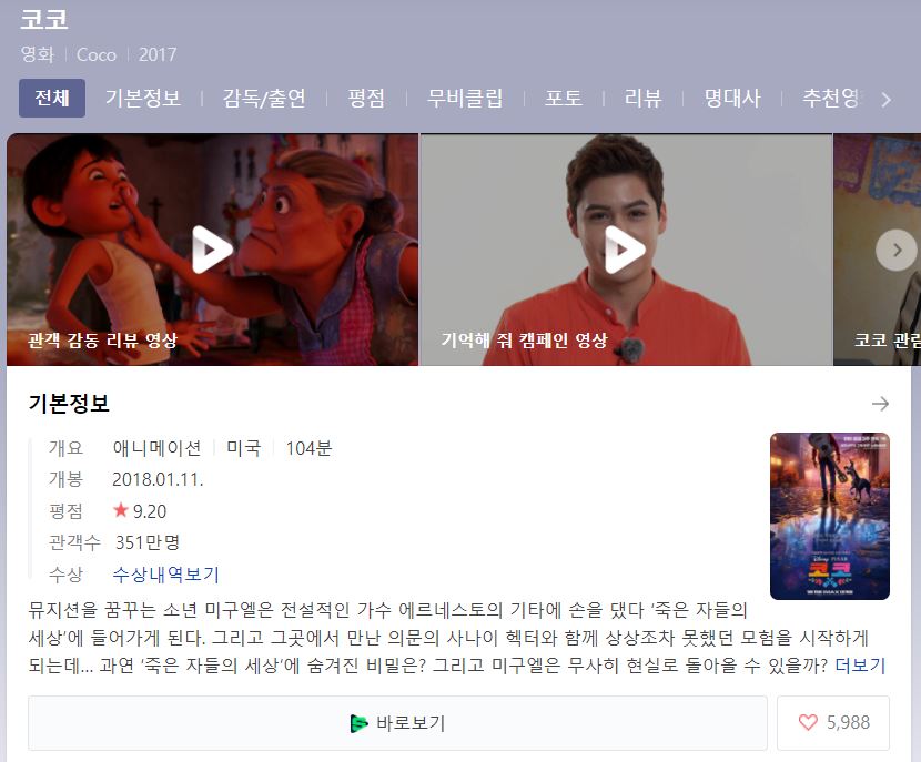 줄거리 - 뮤지션을 꿈꾸는 소년 미구엘은 전설적인 가수 에르네스토의 기타에 손을 댔다가 '죽은 자들의 세상'에 들어가게 된다. 그리고 그곳에서 만난 의문의 사나이 헥터와 함께 모험을 시작하게 되는데... 과연 이곳에 숨겨진 비밀은 무엇일까? 그리고 미구엘은 과연 죽은자의 세상에서 현실 세계로 돌아올 수 있을 것인가?