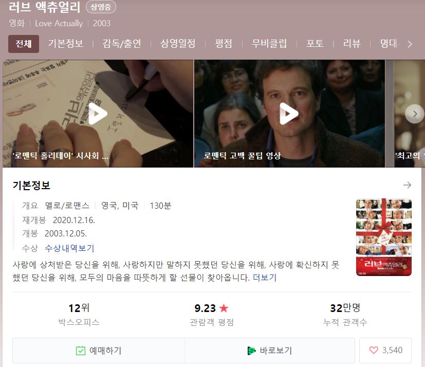 이것 때문에 아직도 프로포즈 할 때 스케치북에 적는 분들이 그렇게 많다고.. 그리고 유명한 영화배우들이 정말 많이 나오는 영화 중 하나로 연말에는 꼭 봐줘야하는 영화죠. 괜히 이 연말 영화 추천 때 안봐주면 아쉽다구요 ㅎㅎ